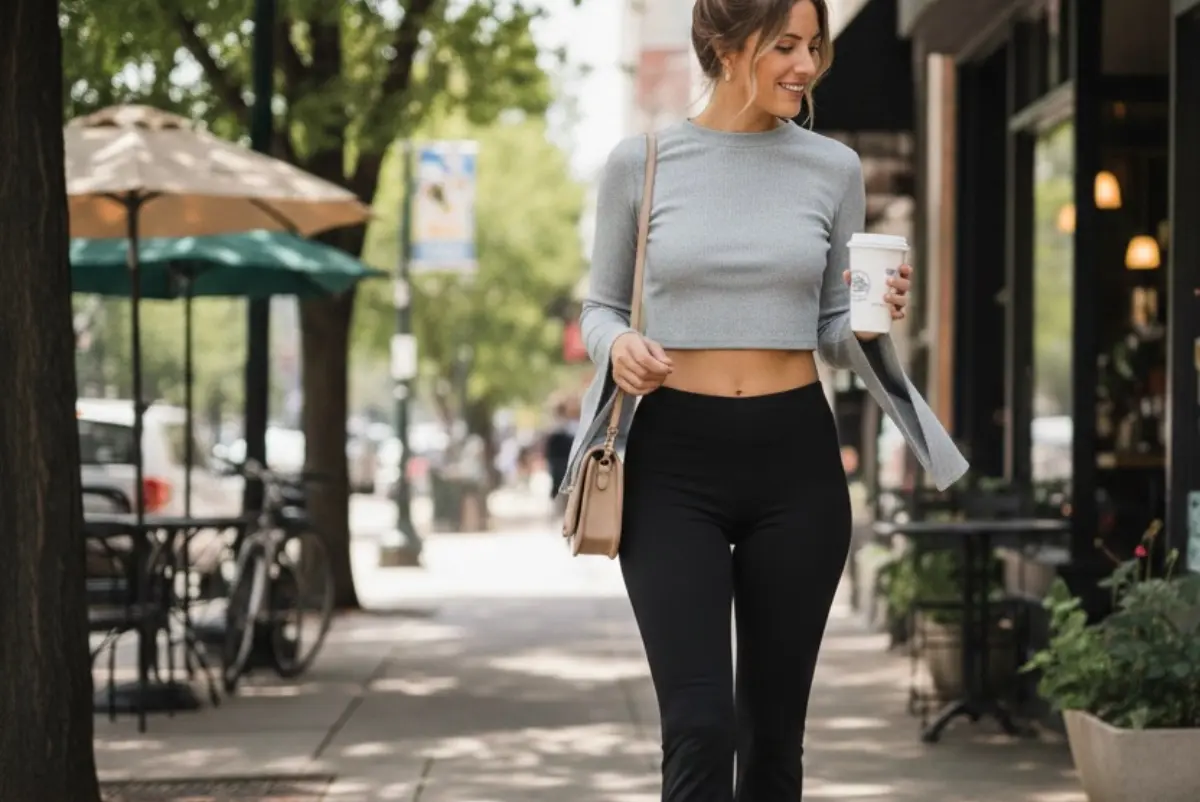 This look sits perfectly between casual and cute. Think fitted top, cropped jacket or blazer, and sleek yoga pants that feel polished but still comfortable. You can go with ankle boots, heels, or even stylish flats, depending on the mood of the night. Add a small shoulder bag and minimal jewelry, and you’ve got an effortless outfit.